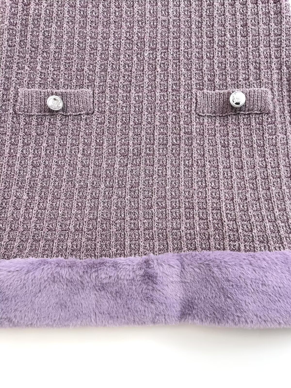 שמלת מיני סרוגה עם שרוולים קצרים ואופנתית לנשים בגימור דמוי פרווה