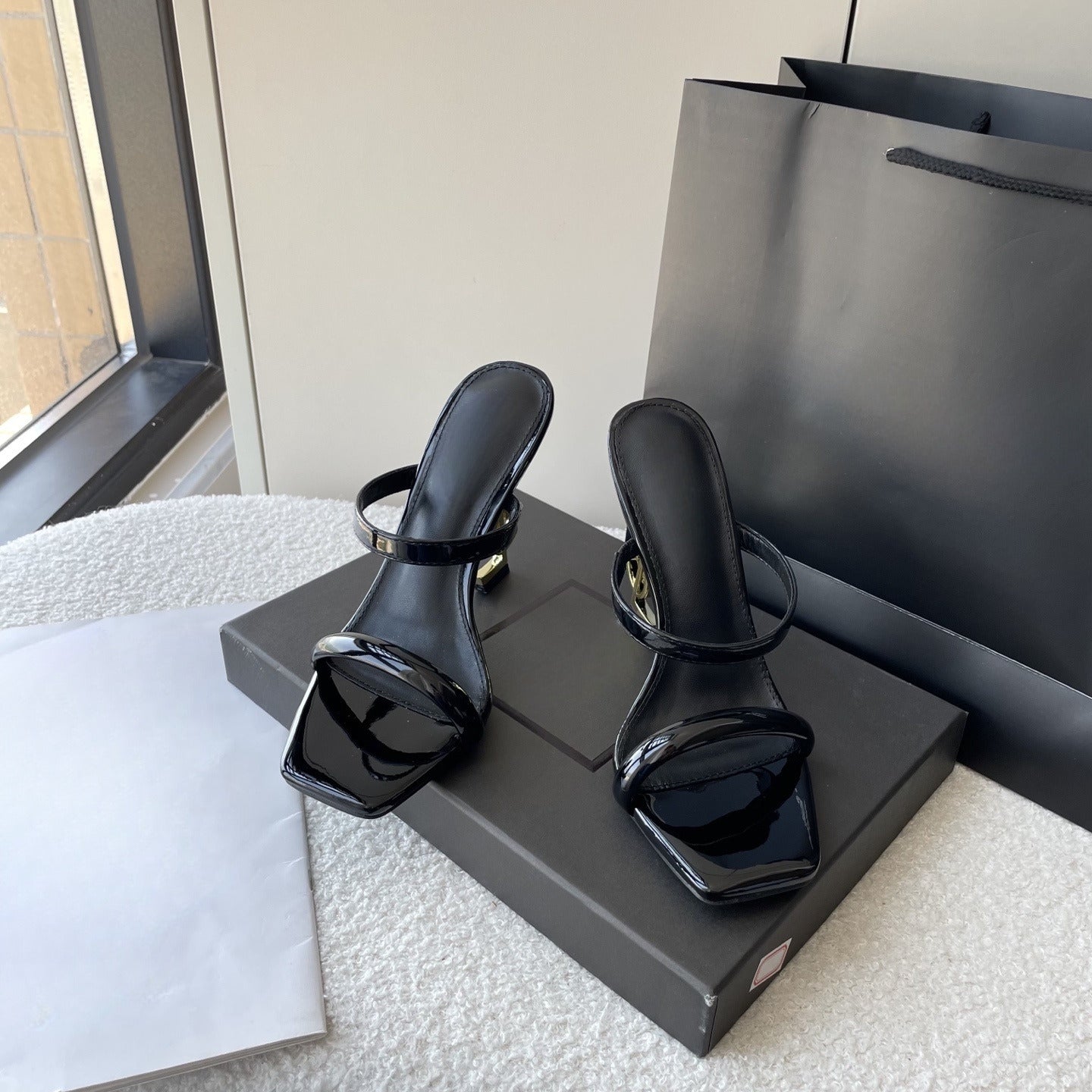 Women's New Fashion Temperament Joker Letters Metal Heel Design High Heels Sandals have a shoe box