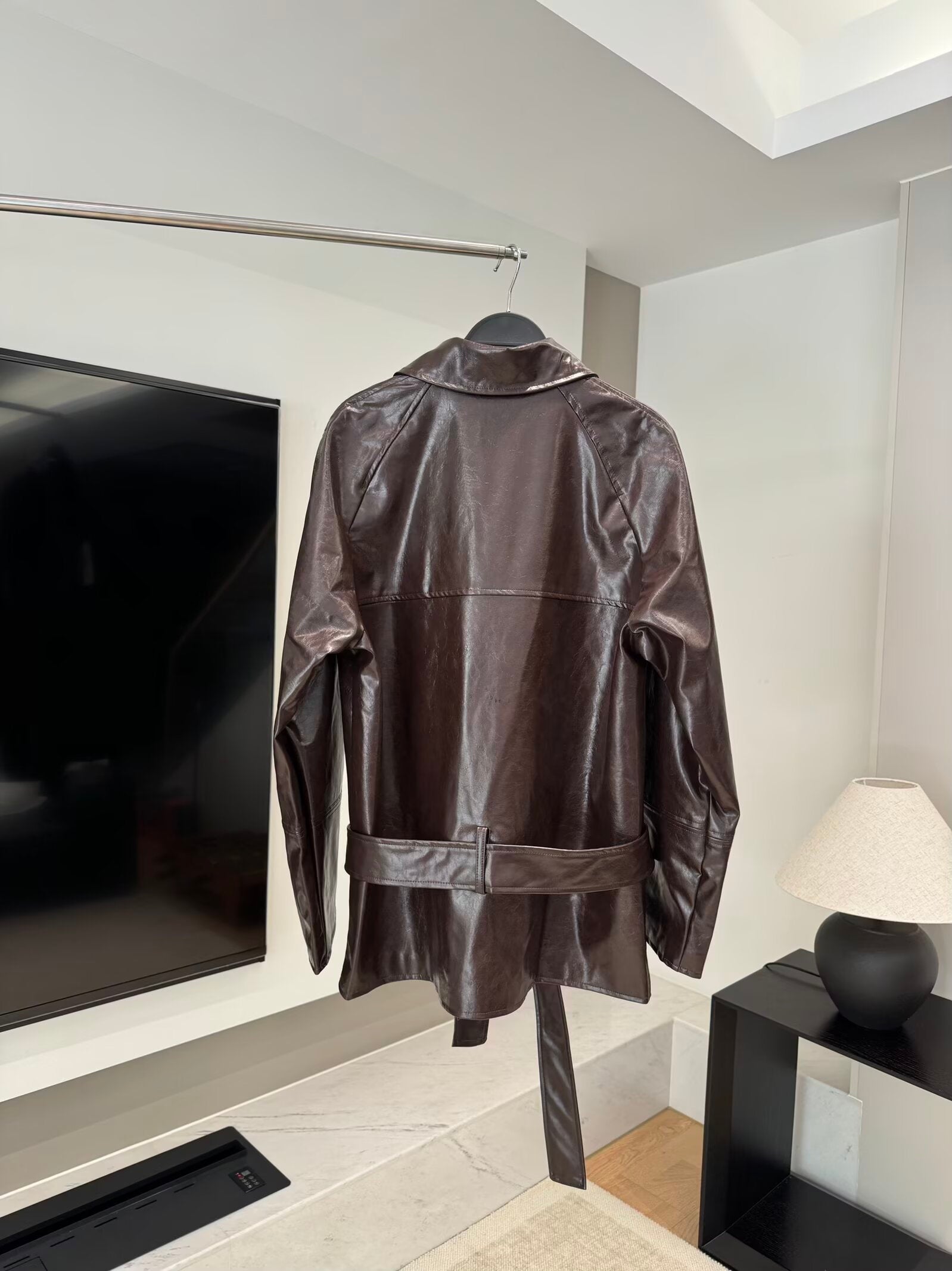 Women's new fashion with Belt short faux leather windbreaker Coat